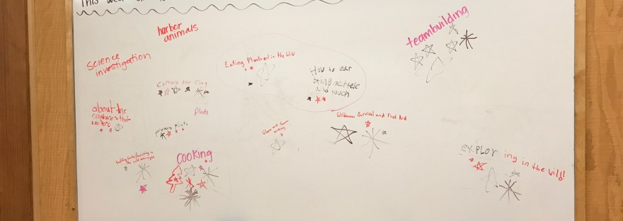 The students struggled at first with my prompt. I added a caveat that their submissions needed to be realistic and fit their teachers’ goals for their time at IslandWood, trying to encourage them away from filling the board with things like “sports” and “video games” and instead to think about why the IslandWood experience could be important. I told the students to read their peers’ ideas, and if they agreed with one that was already on the board, to add a star to indicate another vote. At the end of the brainstorming session, the clear winners were teambuilding, wild edibles/cooking, and learning about the plants and animals of IslandWood. From here, I decided to make the theme for the week community, with focuses in ethnobotany and ecosystems.